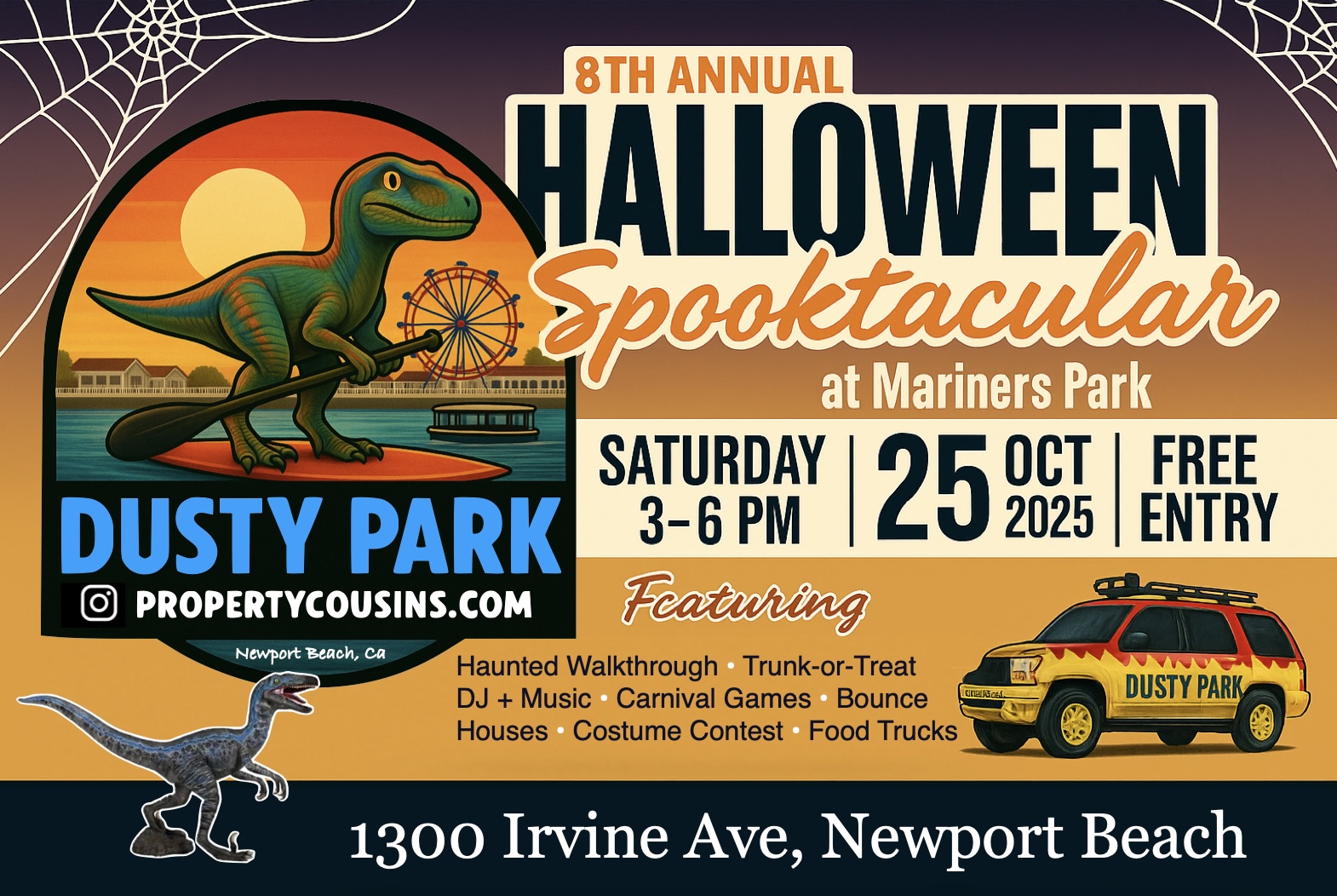 Mark your calendar for Saturday, October 25, 2025 at Mariners Park, Newport Beach. Bring your costumes, your family, and your spooky spirit for a night filled with fun, food, and community hosted by Property Cousins Real Estate.